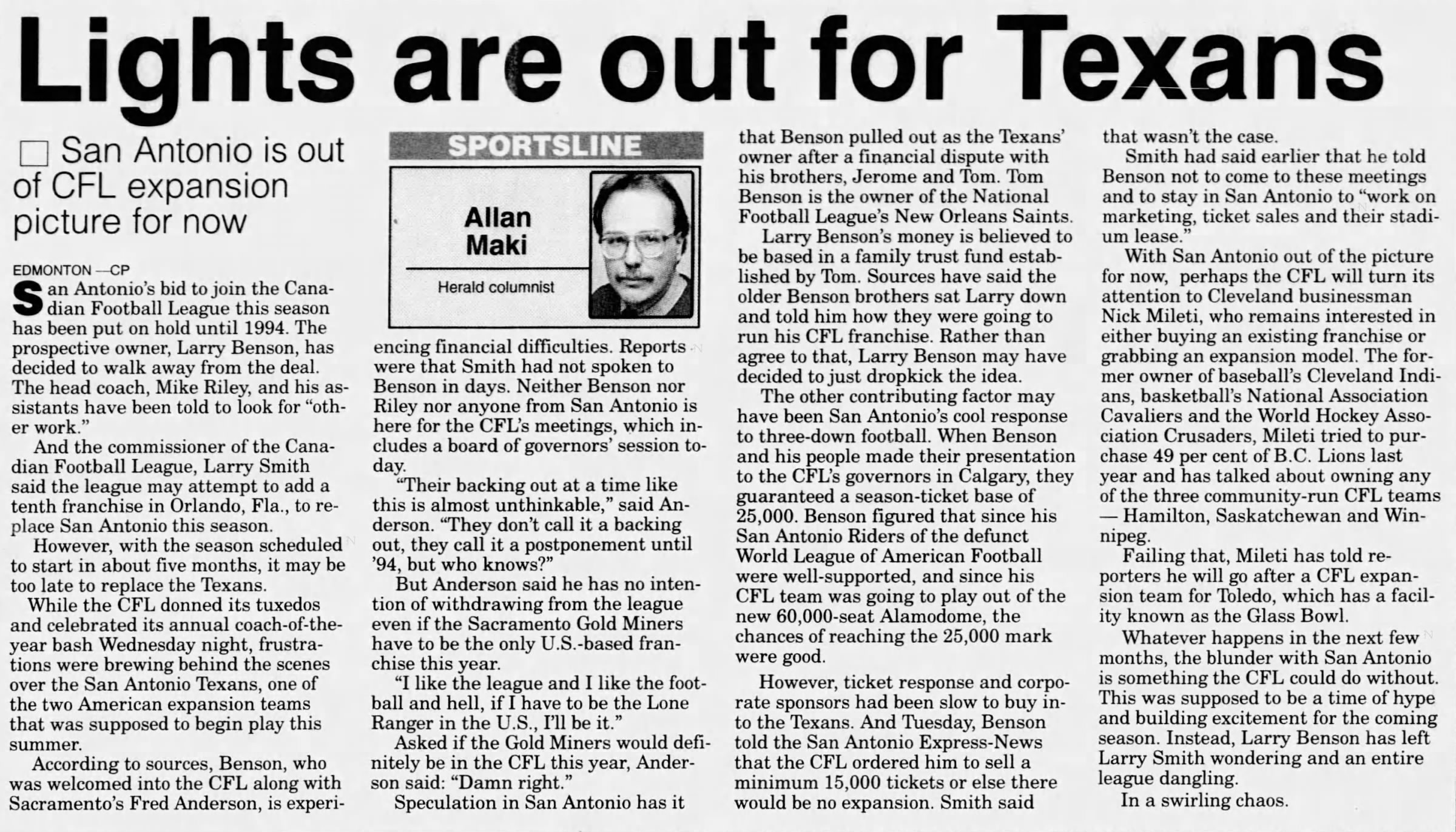 Alas, Benson pulled out two weeks later. Was it cold feet or lack of money or something else? Whatever the case, there would be no CFL football in Texas in 1993.