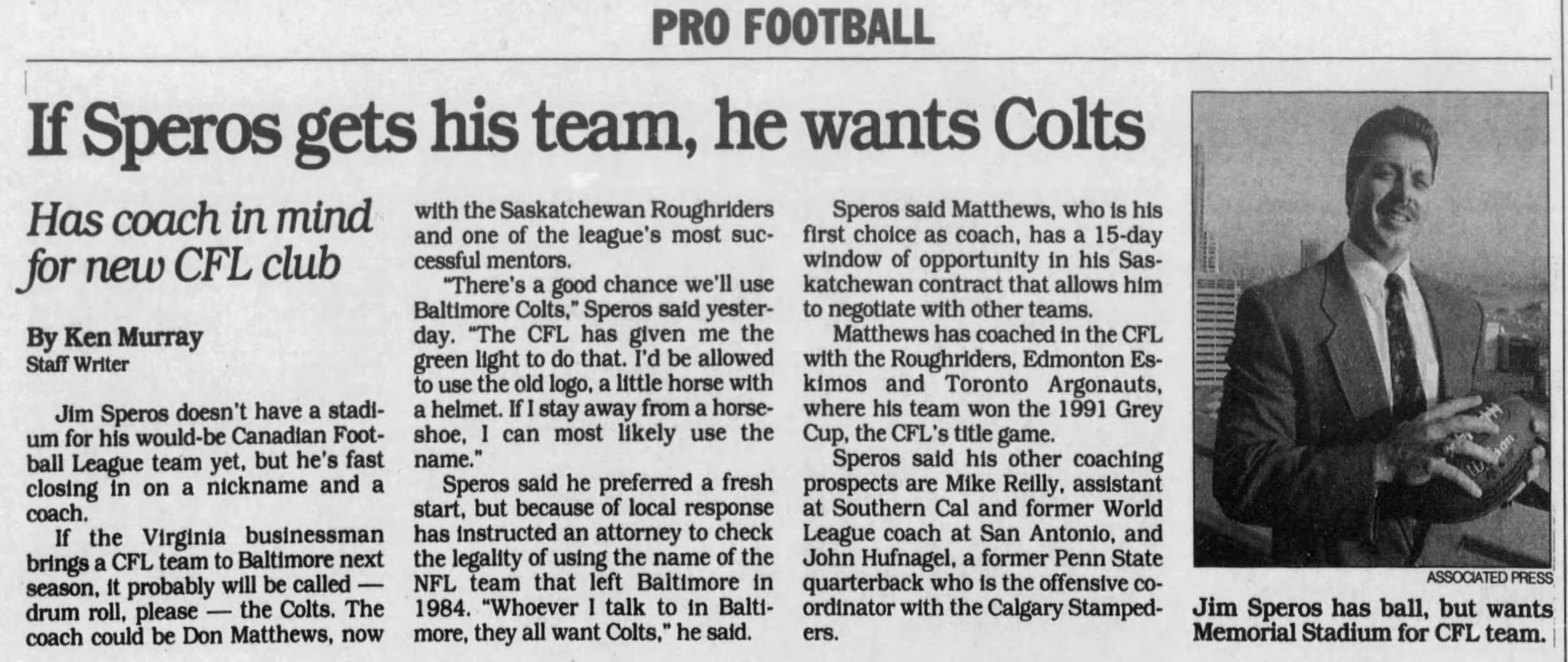 Baltimore Sun article about naming Baltimore’s prospective CFL team the “Colts,”