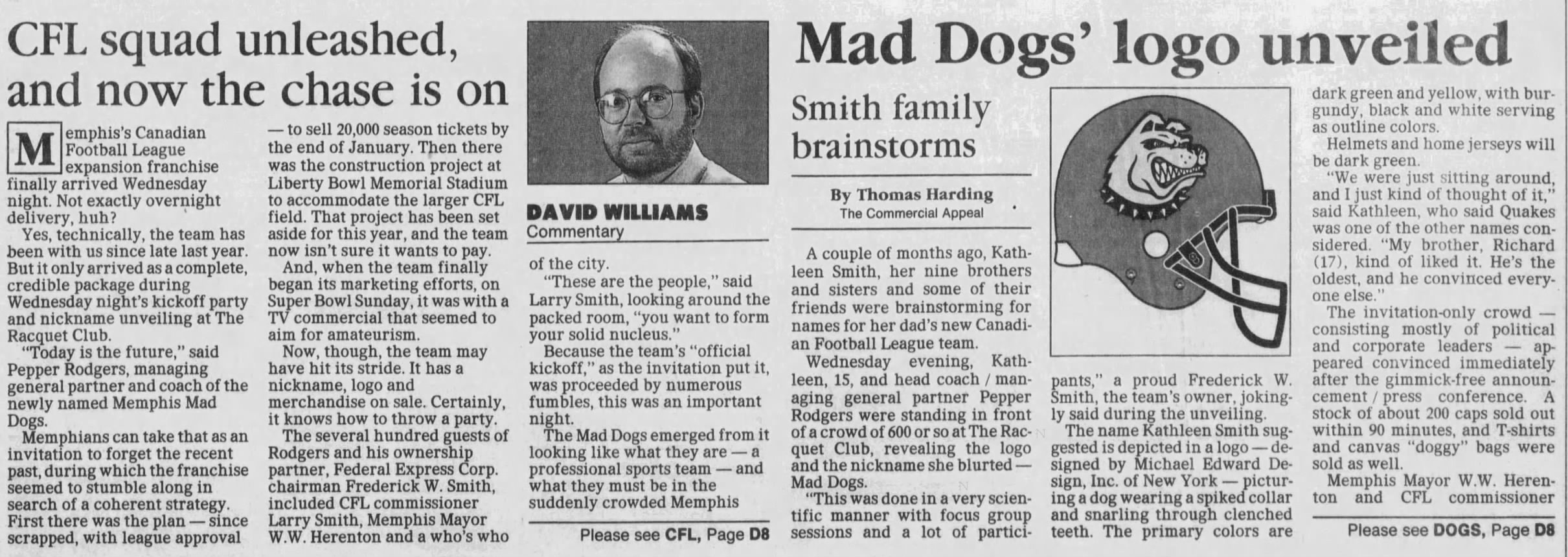 Coverage of the Memphis’ new CFL team, the Mad Dogs, in the Memphis Commercial Appeal.