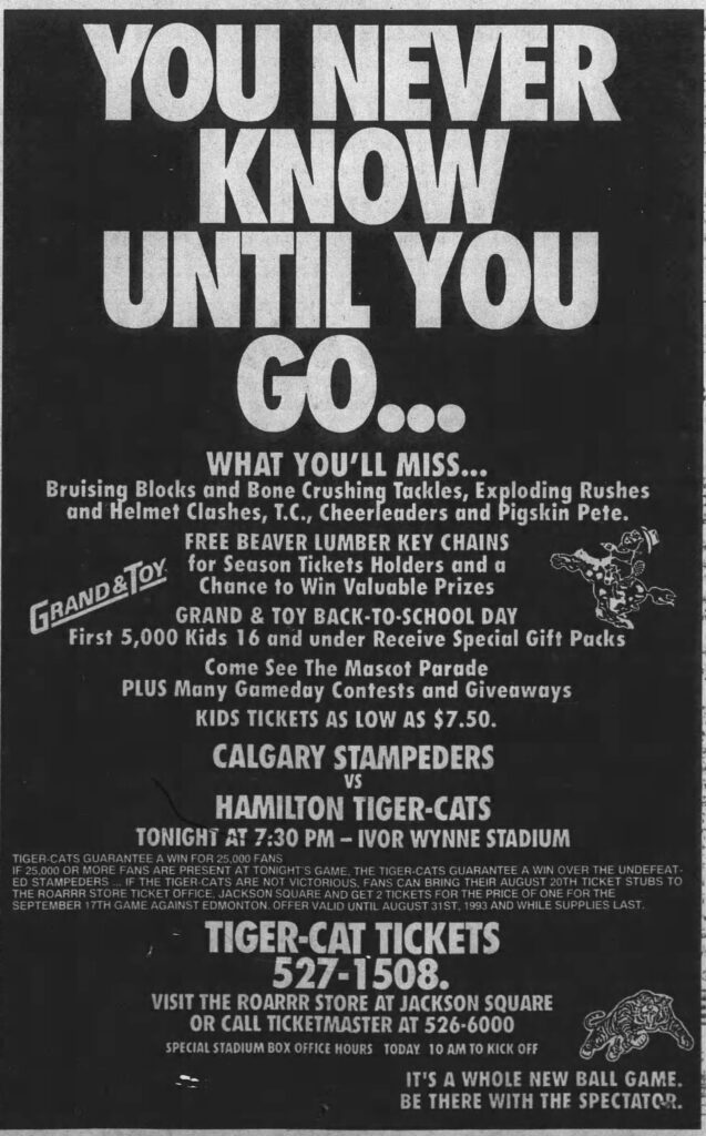 An advertisement for the Hamilton-Calgary game (Hamilton Spectator, 20 August 1993, p. 19.)