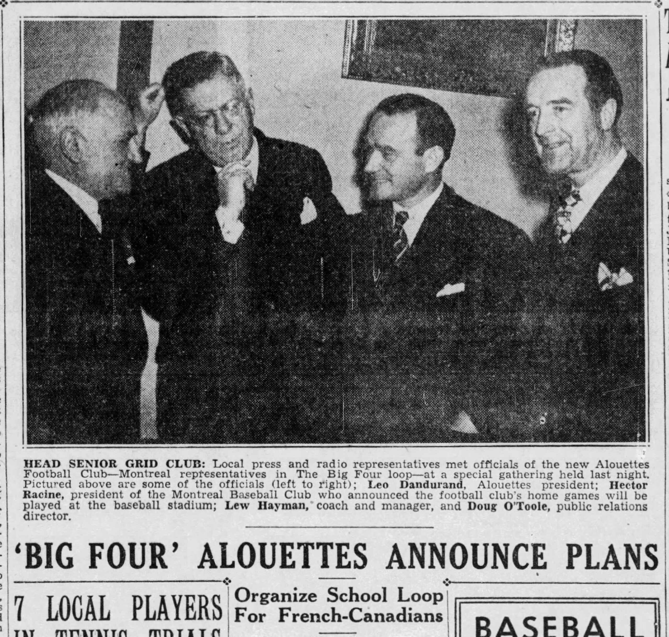 The Montreal Alouettes were founded by Leo Dandurand and Lew Hayman among others. Hayman had led the Toronto Argonauts to several Grey Cups, bringing instant credibility back to Montreal football.