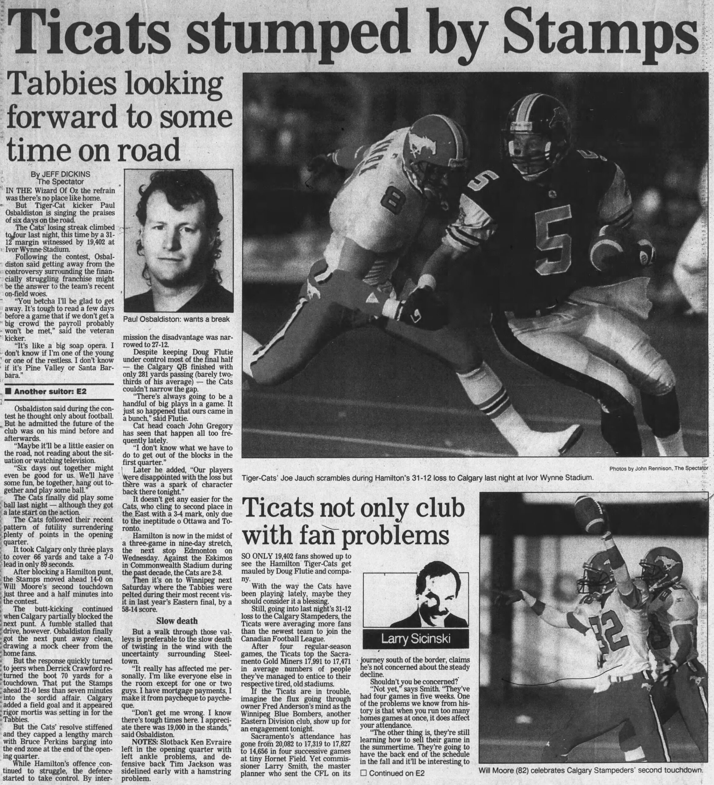 Dickens, Jeff. “TiCats stumped by Stamps.” Hamilton Spectator, 21 August 1993, p. 39.