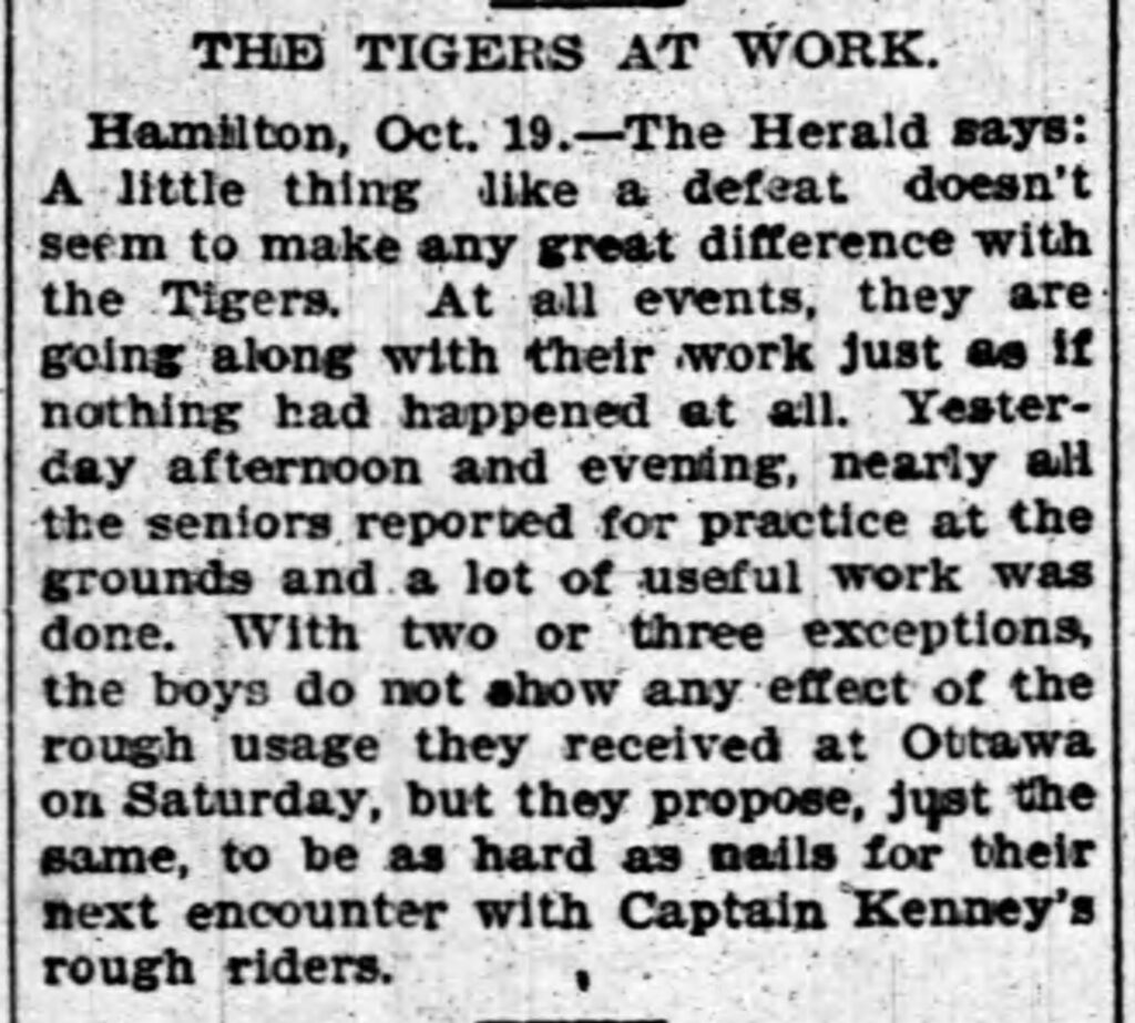 Hamilton Spectator reporter C.A. Mitchell calls Ottawa football players “roughriders” (The Ottawa Citizen, 17 October 1898, p. 6.) Another Hamilton reporter refers to Ottawa as “Captain Kenney’s rough riders”. Kenney was the Ottawa captain. (“The Tigers at Work.” The Ottawa Journal, 19 October 1898, p. 6.)